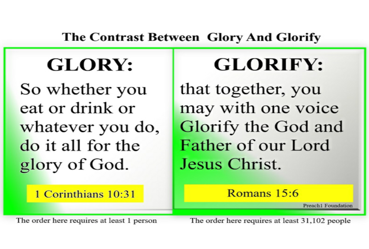 I teach that glory (1 Corthians 1:31) is not the same as glorify (Romans 15:6).