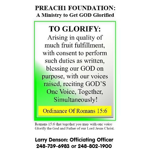 Our 21st century objective is to glorify Father God at Romans 15:6 on Saturday's, this day is our observance for Preach1 Day.